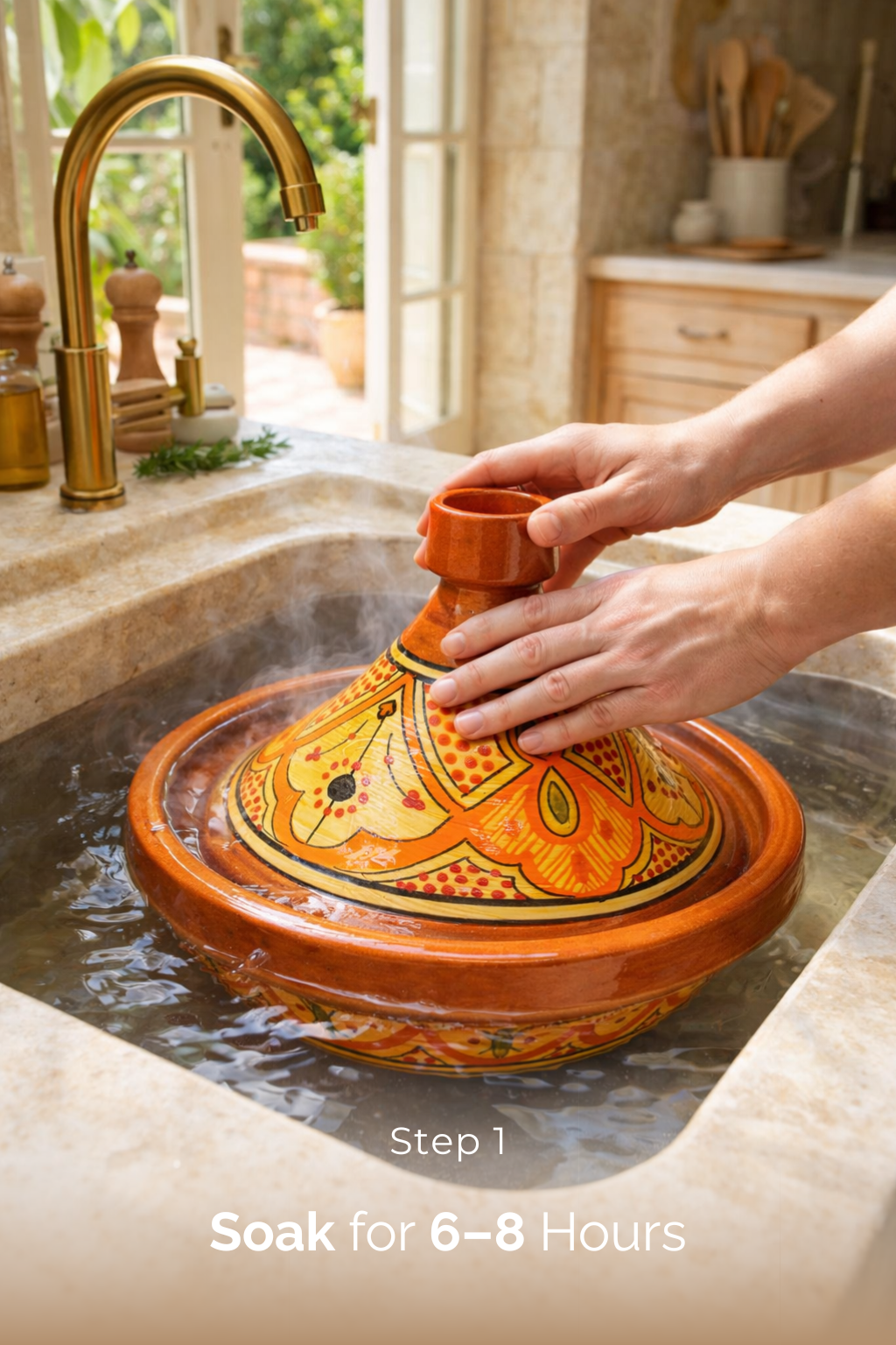 Allow the tagine to cool completely before cleaning. Wash gently using warm water and mild soap, and avoid sudden temperature changes. With proper care, your tagine will last for years.